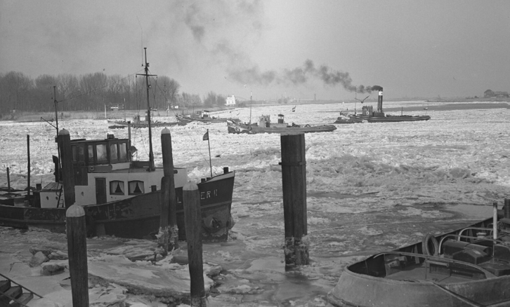 IJsbrekers opereren op de Merwede bij Dordrecht in 1954