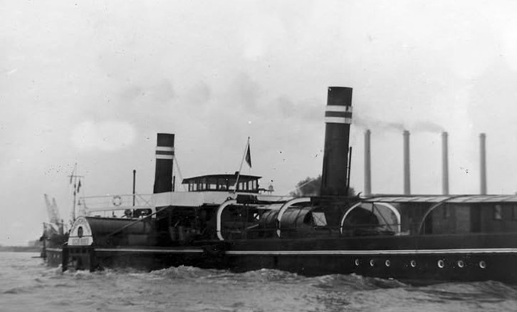 De radersleepboot OSCAR HUBER in de opvaart op de Beneden-Merwede net beneden de Dordtse Electriciteitscentrale.