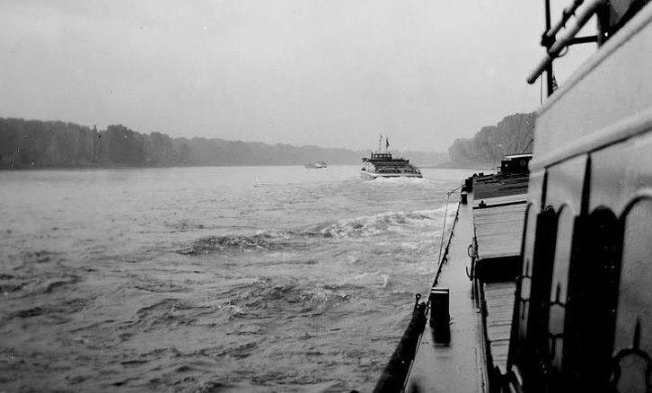 Een foto van september 1952 op de Rijn beneden Straatsburg. De eerste sluis was toen nog ver boven Straatsburg. Het sleepschip ESMARALDA van Wemmers hangt op de 1e lengte achter de DAMCO 10.
