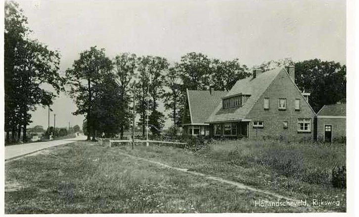 De Riegshoogtendijk met op de achtergrond de bomen aan de Otto Zomerweg in Hollandscheveld omstreeks 1949