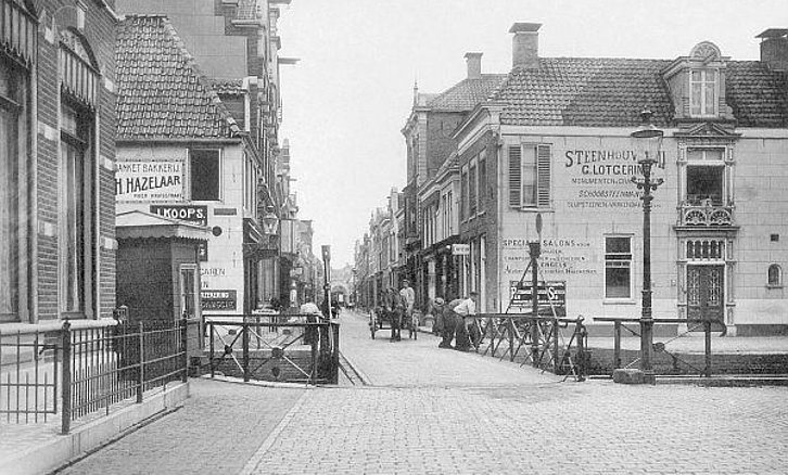 De Beerebrug, gezien vanaf het Zuideinde in de richting van de Hoofdstraat. De brug was toen nog een draaibrug, met het brugwachtershuisje aan deze kant van de brug (waar nu het Galmanspad is). Toen in 1913 de Beerebrug vervangen werd door een ophaalbrug, werd deze eerst de Nieuwe Brug genoemd en pas later de Zuiderbrug. Links vooraan het huis van huisarts Heerspink (later Karsdorp), dat in 1965 plaats moest maken voor de verbreding van het Galmanspad. Aan de overkant links van de brug een huis dat ook is afgebroken en waar nu het Zuideindigerpad is.