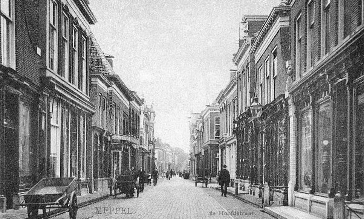 Prentbriefkaart vanaf Hoofdstraat 68 (rechts) richting Zuideinde. Rechts bij de onderbreking in de gevelrij de toegang tot de Brouwersstraat, met op de hoek het pand van Lakke (opschrift: bedden). Links boven de tweede handkar een uithangbord voor de Meppeler Courant. Deze handkar staat voor de rijwielhandel van Van Werven, die in het pand zat waar later (na verbouwing) banketbakker Amoureus zou komen. Op de achtergrond de draaibrug (Beerebrug) naar het Zuideinde: de Zuiderbrug was nog niet gebouwd