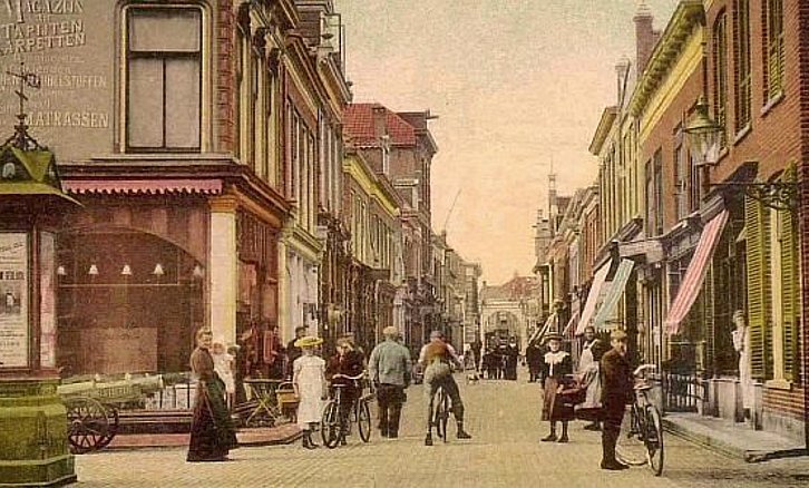 Hoofdstraat vanaf Brouwersstraat richting Kerkhofsbrug. Links ingang Brouwersstraat met reclamezuil. Let op de fraaie reclametekst die op het pand van Keur is aangebracht