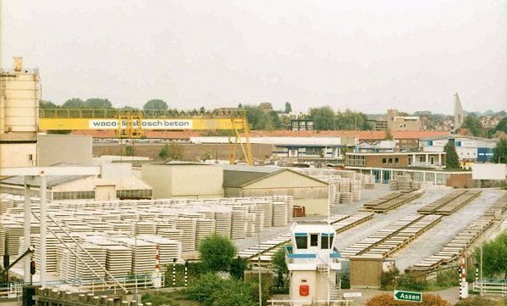 Luchtfoto van de toen net vernieuwde bedieningspost van de Kaapbruggen. Daarachter het bedrijfsterrein van Waco-Liesbosch Beton met de karakteristieke gele hijskraan. Rechts op de achtergrond de toren van de Rooms Kathoieke kerk aan de Grote Oever. Deze foto werd genomen vanaf de silo van de UTD aan het Groeneveld.