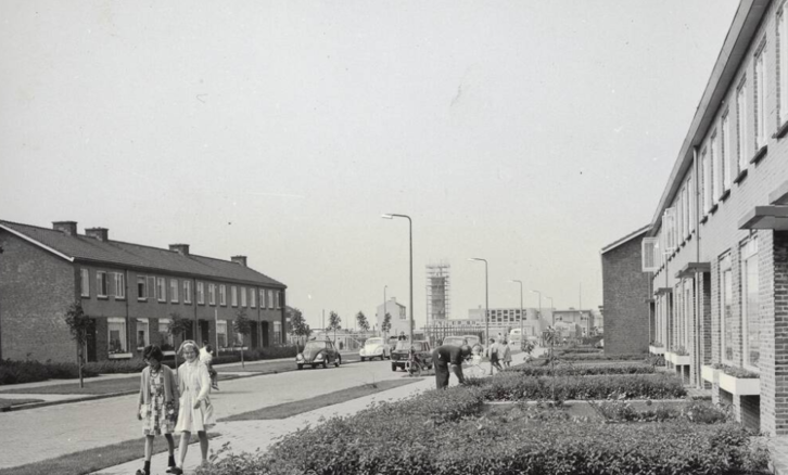De Galjoenstraat te Dronten in 1964. Op de achtergrond de R.K. kerk met vrijstaande toren in aanbouw