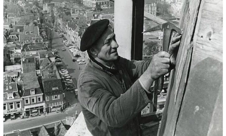 Een leidekker aan het werk op de Bonifatiustoren. In de achtergrond de Nieuweburen, eind jaren ‘60.