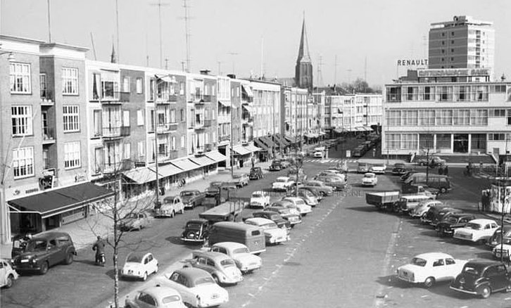 Het Gele Rijdersplein in de jaren 60 met rechts op de achtergrond de Rotterdamsche Bank daarachter de Nilmij-flat aan het Velperplein en de Martineskerk op de Steenstraat