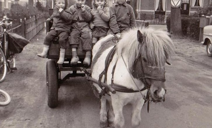 EPE - De Vlijtweg bij de hoek met de Slathstraat in de jaren 60. Pony en kar van schillenboer Henk Jonker.