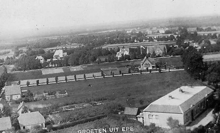 EPE - Panorama van Epe uit 1933 met rechtsonder de Dorpschool. Links enkele huizen aan de Willem Tellstraat. In het midden een paar huizen aan de Quickbornlaan, Wildforstlaan en Heuvellaan.