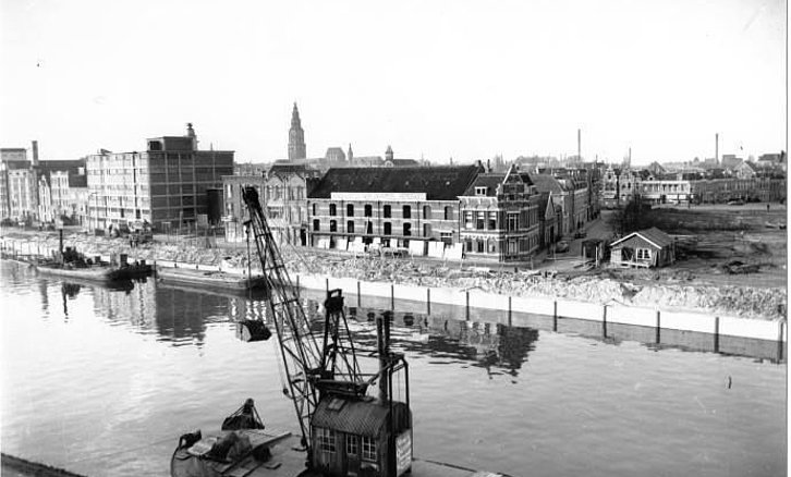 De stad Groningen: De Oosterhaven met gezicht op de Oosterkade bij de hoek met de Damsterkade in 1954