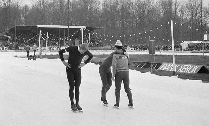 De stad Groningen: Het Stadspark NK schaatsen op 10 januari 1976. Op de foto Hans van Helden, Piet Kleine en Leen Pfrommer