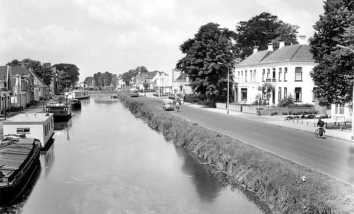 HOOGEZAND-SAPPEMEER - Het Winschoterdiep met rechts de Hoofdstraat Geheel rechts de ingang van Elektro Technisch Bureau Herman. G. Eekels, daarnaast het pand van advocaat Bast - jaren 60