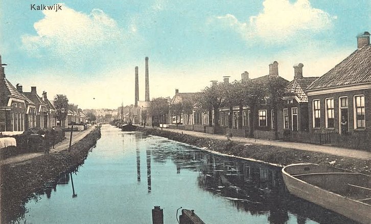 HOOGEZAND-SAPPEMEER - De Beukemastraat met rechts de Fabriekskadeaan het Kalkwijksterdiep in 1925 met op de achtergrond de strokartonfabriek Hooites-Beukema.