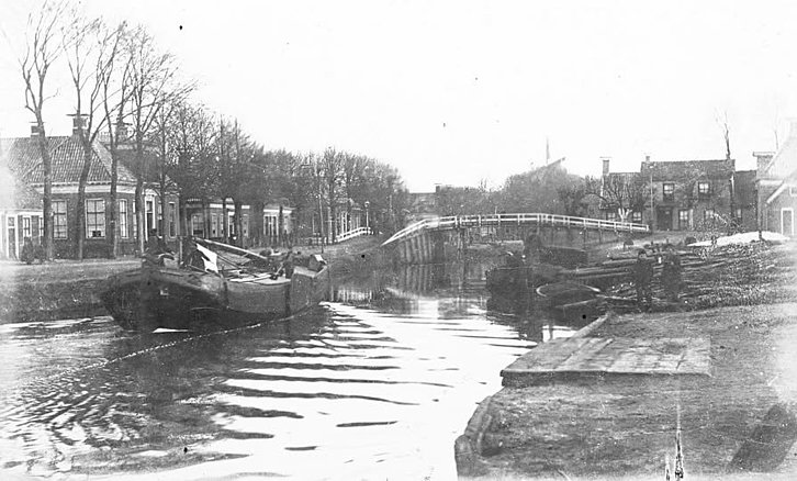 HOOGEZAND-SAPPEMEER - Het Winschoterdiep in 1892 gezien vanuit Hoogezand in de richting van Sappemeer met op de achtergrond de Bonthuizerbrug. Links de Hoofdstraat en rechts voormalige Zuiderstraat, later Hoofdstraat.