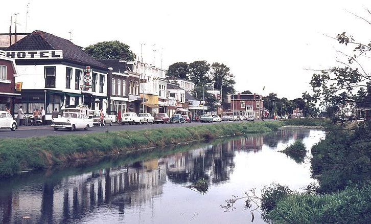 HOOGEZAND-SAPPEMEER - De Noorderstraat met hotel Struvé aan de linkerkant en op de voorgrond het Winschoterdiep begin jaren 70