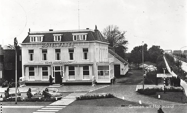 HOOGEZAND-SAPPEMEER - Hotel Faber aan de Meint Veningastraat nr. 123. Rechts het verlengde van de Kerkstraat met op de achtergrond de Knijpsbrug. Gezien in noordelijke richting. ca 1956