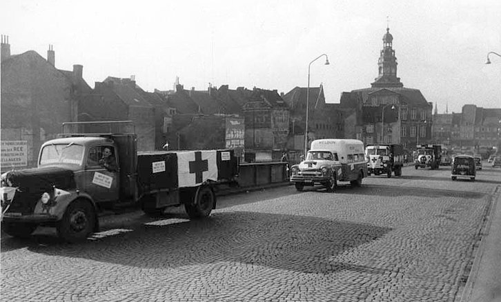 MAASTRICHT - De Wilhelminabrug. Rode Kruis, voedseltransport naar Hongarije na de Russische inval. 1956