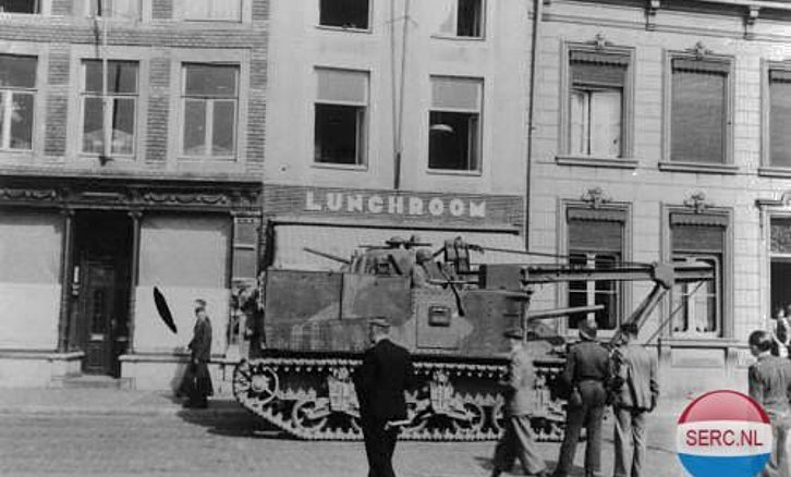 Sittard: Amerikaanse tank van de genie toepen op de Markt, voor luchroom schrugers