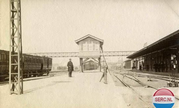 Venlo: Gezicht op het tweede perron van het station Venlo van de Staatsspoorwegen te Venlo met het seinhuis E en de voetbrug over het emplacement. 1887