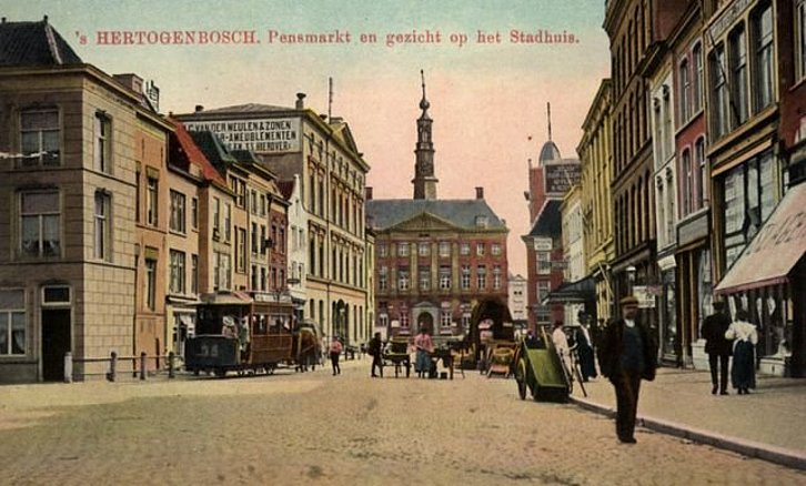DEN BOSCH VROEGER - De paardentram (met open achterbalkon) bij de stopplaats op de Pensmarkt, prentbriefkaart uit ca. 1910