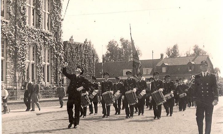 Eindhoven. De Antoniusstraat in 1947 met de marcherende Philips' Harmonie