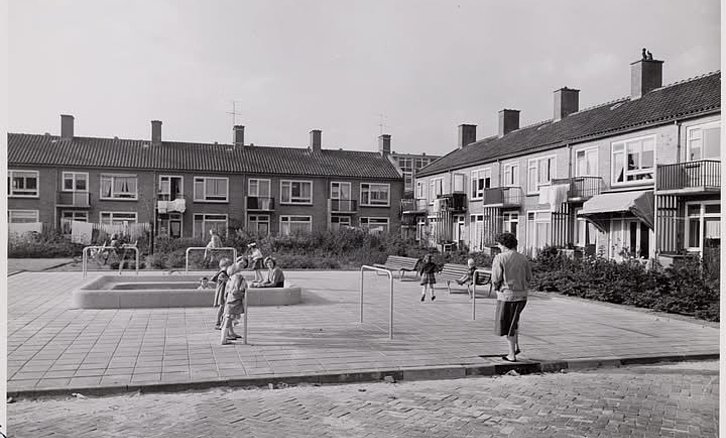 AMSTERDAM - De J.A. der Mouwstraat met de speelplaats. Rechts de achterkant van de woningen in de Slauerhoffstraat - begin jaren 60
