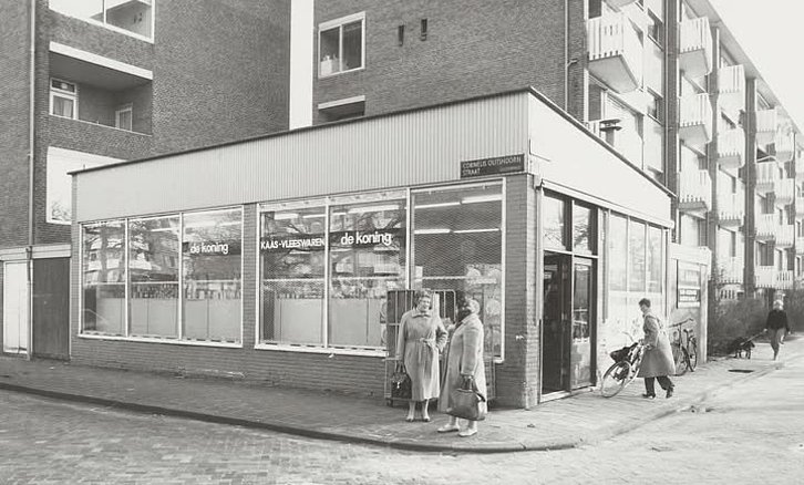 AMSTERDAM - De Aalbersestraat bij de hoek met de Cornelis Outshoornstraat stond vele jaren een supermarkt (foto uit de jaren 70)