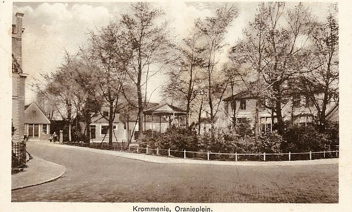 KROMMENIE - Het Oranjeplein ca. 1920 met op de achtergrond Noorderhoofdstraat en ULO school