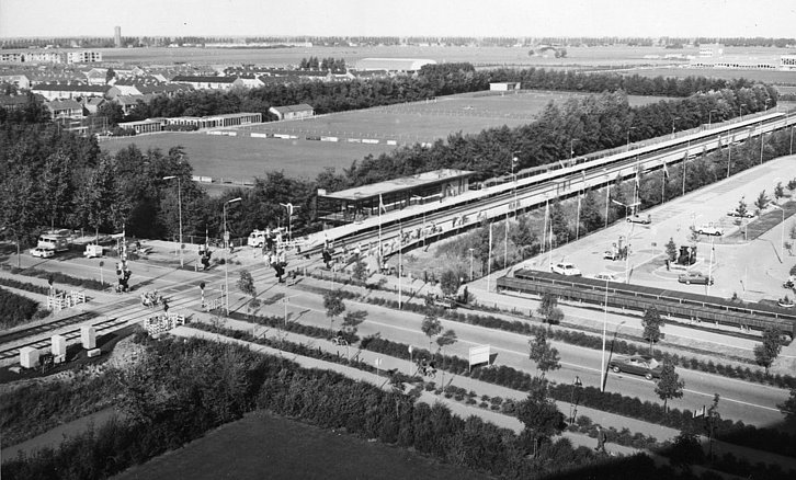 PURMEREND - NS-station Purmerend Overwhere, tijdens de opening van het station op 24-09-1971. Op de achtergrond de velden van voetbalvereniging Purmersteijn