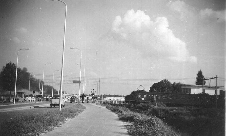 De spoorwegovergang bij fort Blaucapel in de zomer van 1961 met op de achtergrond de eerste huizen van Tuindorp-Oost