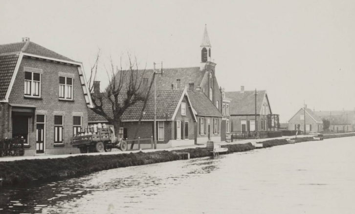 Zicht op de Gereformeerde kerk aan de Gijbelandsedijk. Links voor een melkwagen - begin jaren 50