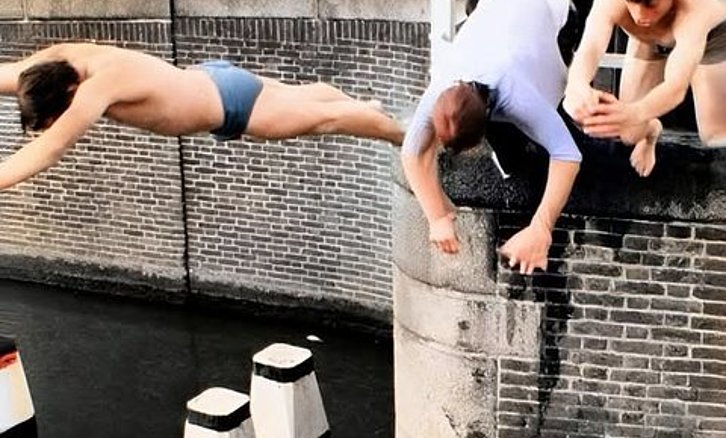 DELFT - De Oostsingel - Kinderen duiken vanaf de Koepoortbrug aan de Oostsingel in het water. Omstreeks 1970