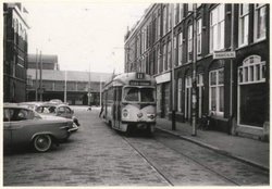 De Jan Blankenstraat met zicht op Station Holland Spoor waar lijn 11 de straat binnen komt rijden eind jaren 60
