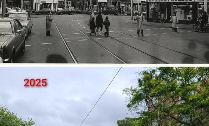 Met dank aan Otman El Hitouri - Om de hele foto te zien even op de foto klikken aub. De Edisonstraat, gezien richting Beeklaan in 1975 en 2025