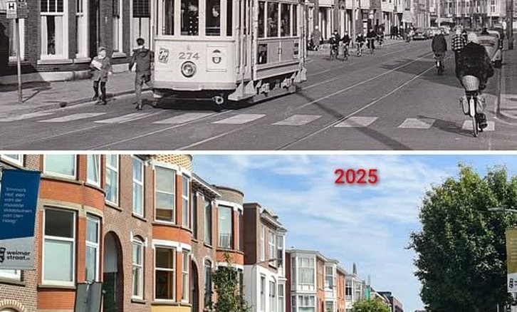 Met dank aan Otman El Hitouri - Om de hele foto te zien even op de foto klikken aub. De Weimarstraat ter hoogte van de Valkenboskade in 1961 en 2025