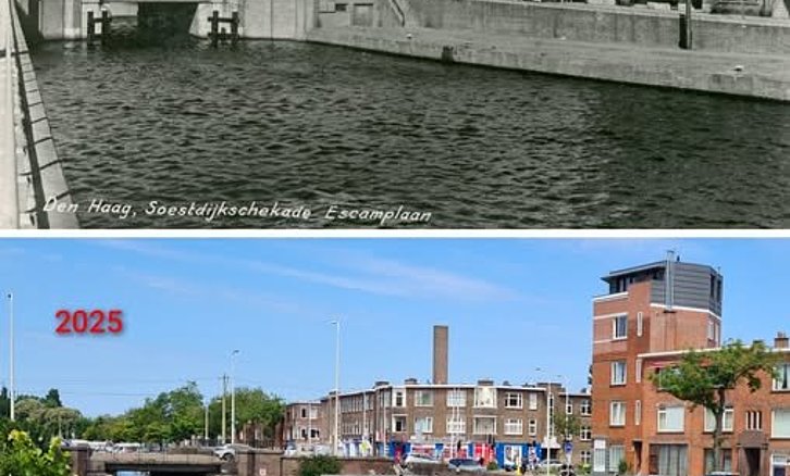 Met dank aan Otman El Hitouri - Om de hele foto te zien even op de foto klikken aub. De Soestdijksekade bij de hoek met de Escamplaan in 1950 en 2025.
