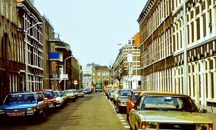 De Netscherstraat omstreeks 1979 gezien vanaf de Hobbemastraat naar de Ruijsdaelstraat en de Delftselaan op de achtergrond
