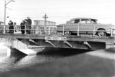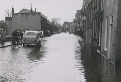 Dordrecht: De Korte Nieuwstraat en in het verlengde de Nieuwstraat, gezien vanaf de Vest, links het Arend Maartenshof; wat verderop staat een straat blank als gevolg van de watersnood van 1953.