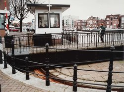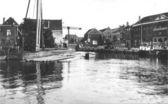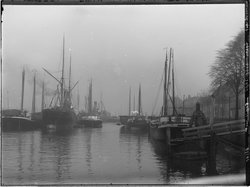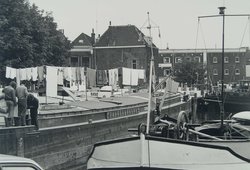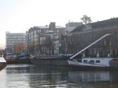 Dordrecht 1998. De Kalkhaven met binnenvaartschepen en de Achterhakkers gezien naar het Keizershof omstreeks 1980