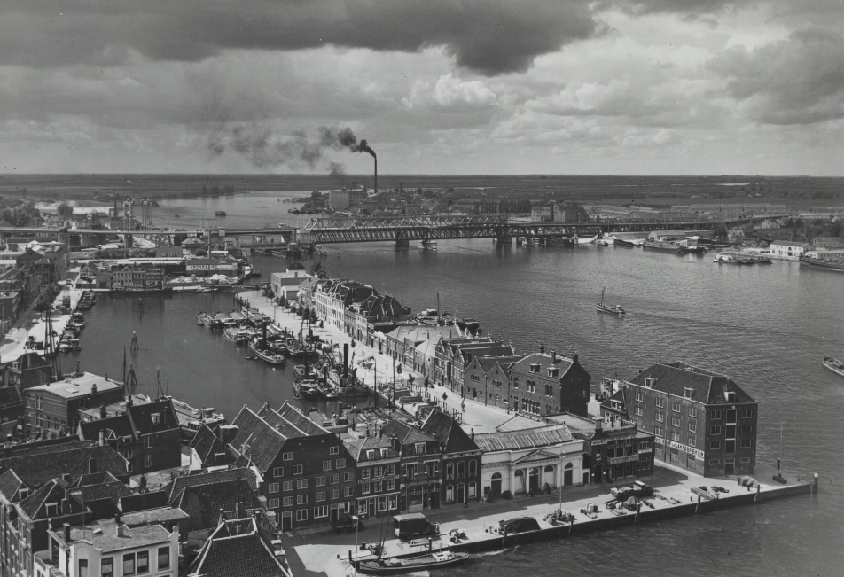 Luchtfoto 1953 met de Kalkhaven en Bomkade, met op achtergrond de spoorbrug en Zwijndrechtse brug over de Oude Maas