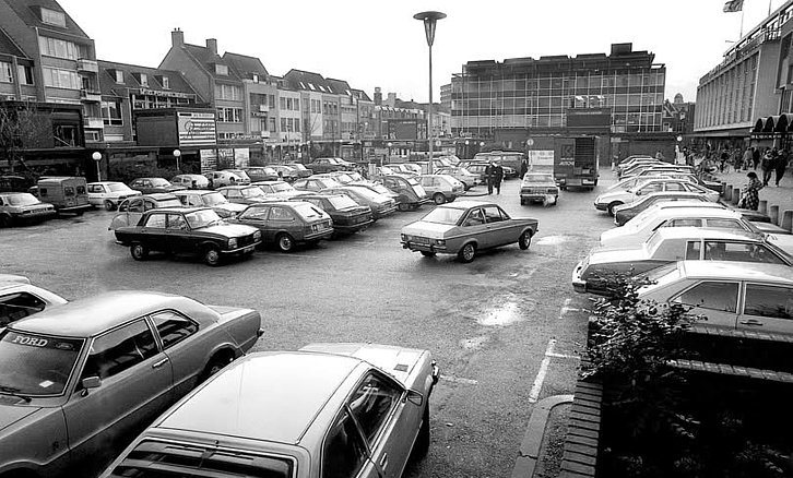 DORDRECHT- Het Statenplein 1983. Vol auto's, links Poppeliers en kiosk van Rawhide jeans. Achtergrond links Coster kleding en Royal Fust.