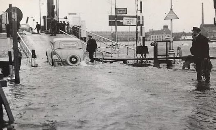 Dordrecht Oudste Stad van Holland - Hoog water aan het Zwijndrechtse veer. Het pontje naar Dordrecht vaart gewoon heen en weer. Foto uit 1938
