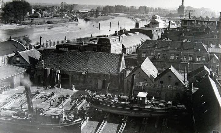 Dordrecht Oudste Stad van Holland - De Bleijenhoek in 1927 met zicht op het Wantij vooraan de scheepswerf Koopman en verder dat witte gebouw de kalkfabriek met daarachter scheepswerf Hoebee en de Watertoren