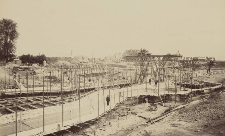 Binnensluishoofd, in aanbouw zijnde fundering. Gezichtspunt ten zuiden van het binnensluishoofd, boven de oude vestingwal 1890