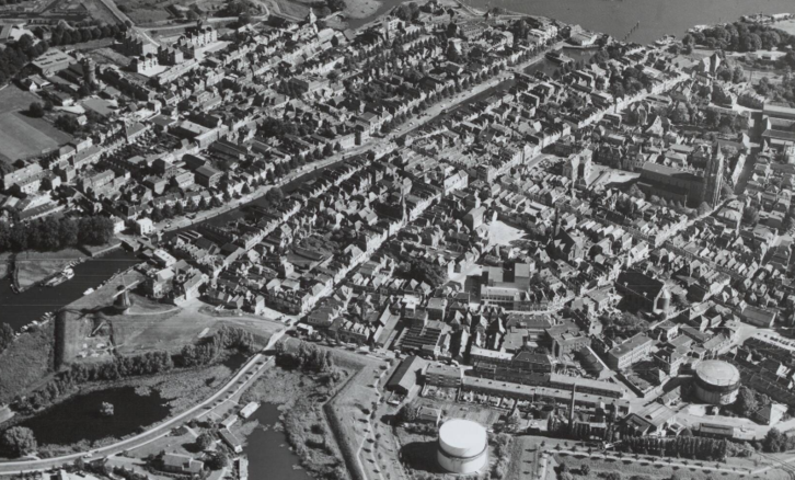 Luchtopname Gorinchem 1962. De oude binnenstad met de St. Janskerk, het stadhuis en de nieuwe stadsgehoorzaal
