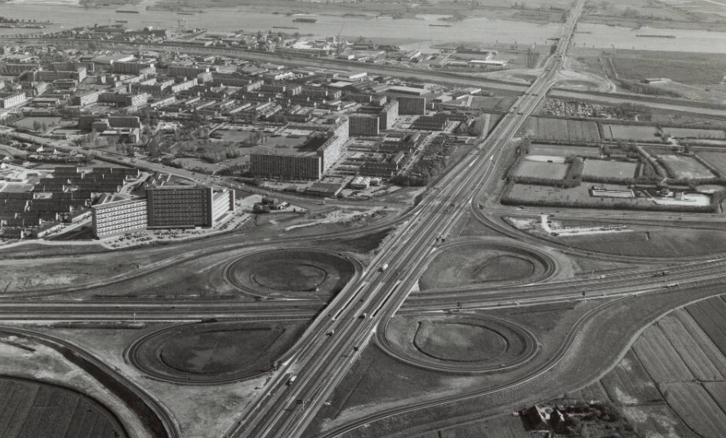 Luchtfoto Gorinchem bij het Klaverblad Gorinchem met verkeersbrug Merwede in 1977