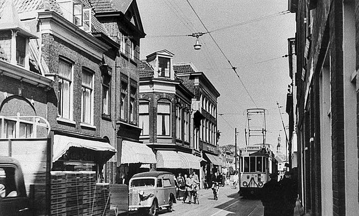 LEIDEN - De Haarlemmerstraat aan het begin van de jaren 50. De gele tram gaat hier richting Haven ter hoogte van de Koestraat.