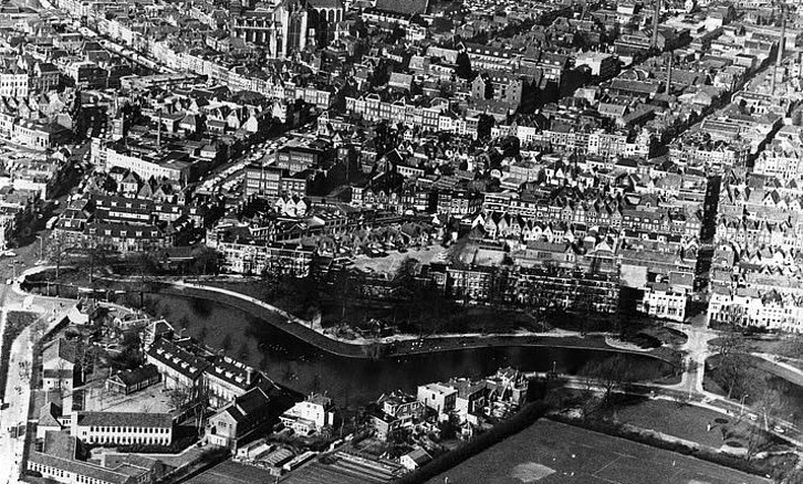 LEIDEN - Luchtfoto van de zuidoostelijke binnenstad tussen de Korevaarstraat en de Kraaierstraat met de Zoeterwoudsesingel op de voorgrond. Op de achtergrond de Hooglandse Kerk en de Burcht. ca jaren 80