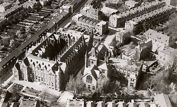 LEIDEN - Luchtfoto van Vreewijk uit 1928 van KLM Aerocarto. Onderaan de daken van huizen aan de Jan van Goyenkade. Daartussenin is de Hugo de Grootstraat te zien