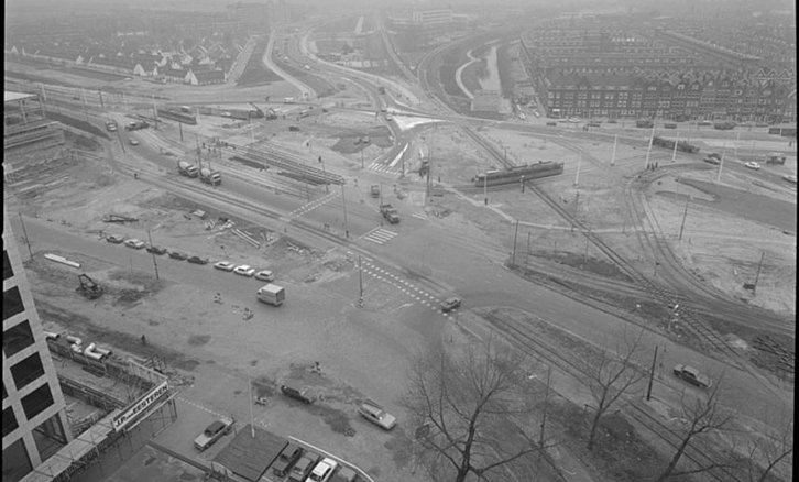 ROTTERDAM - Het Marconiplein en de Tjalkaan in 1972 met links het Witte Dorp en rechts Spangen.